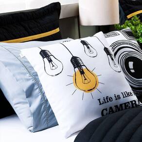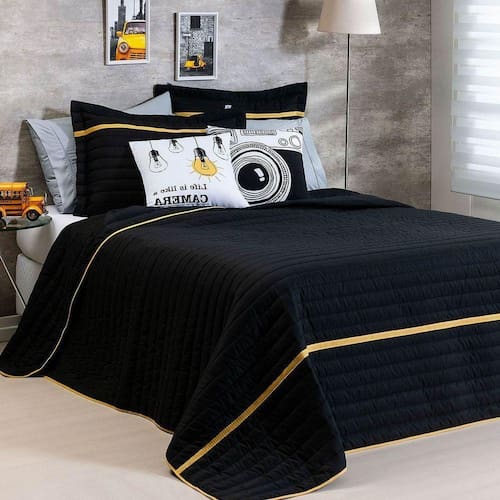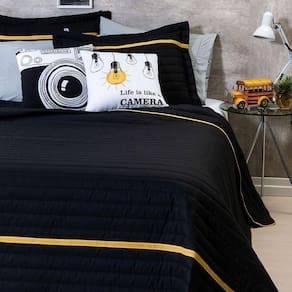 Renove o visual do seu quarto com nosso incrível e confortável Kit Inove. Surpreenda-se com o conforto e maciez do tecido. O kit é composto por um cobre leito matelassado dupla face preto com detalhe de viés, porta travesseiro também matelassados com detalhe de viés colorido e duas capas de almofadas estampadas digitalmente, com estampa apenas na parte frontal e zíper invisível super discreto.