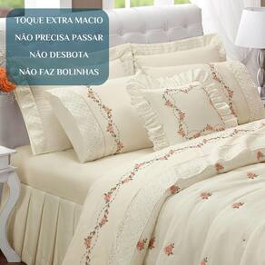 Sendo: 01 Cobre leito Bordado 2,60m x 2,40m 02 Porta-travesseiros detalhe em lase 75cm x 55cm 01 Capa de almofada Bordado Floral e detalhe em lase 45cm x 45cm 01 Refil de almofada 40cm x 40cm 01 Rolo com bordado floral e detalhe em lase tamanho irregular