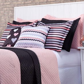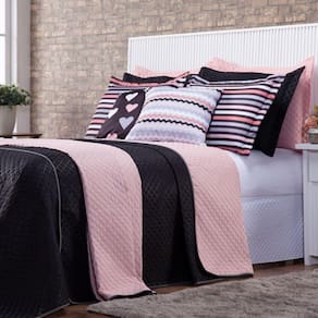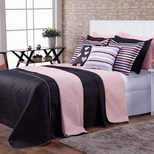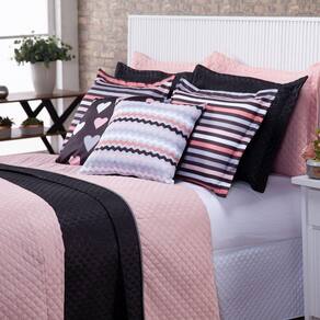 Confeccionado em tecido Microfibra 100% Políester, a nova Coleção Sophia vem trazendo um toque macio, com porta em acabamento debrum, o cobre leito com enchimento em manta dupla face, permitindo o uso dos dois lados (preto e salmão) com lindos detalhes no porta-travesseiro listrado e nas duas almofadinhas estampadas em chevron e corações, tudo para combinar com a sua decoração! Produzido num rigoroso controle de qualidade, dando um toque de requinte para o ambiente. Confira! Contém: 01 Cobre Leito 2,15m x 1,60m 01 Porta Travesseiro Matelado (Preto) 70cm x 50cm 01 Porta Travesseiro Estampado 70cm x 50cm 02 Almofadas Quadradas Estampadas 45cm x 45cm Composição: Tecido Superior: Microfibra 100% Poliéster Tecido Inferior: Microfibra 100% Poliéster Enchimento: 100% Poliéster Porta Travesseiro Matelado: Microfibra 100% Poliéster Porta Travesseiro Estampado: Microfibra 100% Poliéster Composição dos Refis: Externo: 100% Polipropileno Enchimento: 100% Poliuretano Instruções de Uso e Lavagem: Vide etiqueta do produto. Foto meramente ilustrativa. Variação das cores podem ocorrer de acordo com o monitor.