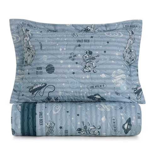 Cobreleito Casal Espacial 200 Fios Karsten Cobreleito Casal 200 Fios Karsten O jogo de colcha Espacial é uma explosão de criatividade e conforto. De um lado, o astronauta rockstar se apresenta em uma cena vibrante no espaço; do outro, uma padronagem listrada com estrelas garante versatilidade para diferentes composições. O porta-travesseiro acompanha o tema, reforçando a unidade visual. Com acabamento em matelassê e enchimento leve, esse conjunto é ideal para deixar o quarto mais lúdico e estiloso, sem abrir mão da praticidade no dia a dia. Contém:1 Cobreleito dupla face. Tamanho: 2,20m x 2,60m2 Porta Travesseiros com 3 abas. Tamanho: 50cm x 70cm. Composição: 200 fios, 100% algodão, Enchimento 100% PoliésterEstampa: EspacialMarca: Karsten Marca: Não Informado