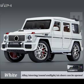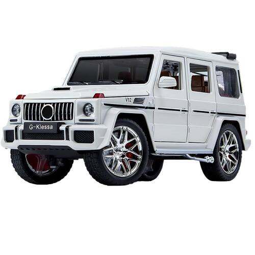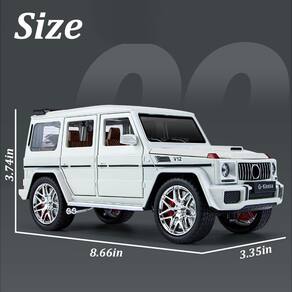 Modelo de coche coleccionable de fundición de aleación con función de retroceso para niños y adultos. - ?Calidad Premium y Seguridad?El modelo de coche G63 fundido a presión está hecho de materiales de aleación y neumáticos de goma, lo que lo hace seguro para que los niños jueguen. Presenta detalles interiores y exteriores muy detallados, muy resistente y duradero. - ?Tamaño?Escala 1/24, 20,5 x 9,5 x 8,5 cm, peso aproximado 520 gramos. El modelo de coche con embalaje atractivo es ideal para que los niños pequeños jueguen y lo transporten. Ayuda a los niños a aprender más sobre automóviles, ampliar sus conocimientos, mejorar la coordinación mano-ojo y la velocidad de reacción durante el juego. - ?Función?No requiere baterías, pero el vehículo tiene una potente función de retroceso. Simplemente empújelo hacia atrás y suéltelo; el coche avanzará una larga distancia. Cuenta con tres posiciones de cambio: en segunda velocidad se encienden las luces delanteras y traseras; en tercera velocidad, al presionar las dos ruedas delanteras, se activan breves efectos de sonido y luz, muy atractivo tanto para niños como para coleccionistas. - ?Colección?Para quienes aman coleccionar modelos de coches, este modelo es sin duda un tesoro raro. Cada detalle ha sido cuidadosamente pulido; el interior es muy realista. Los detalles internos y externos del modelo hacen referencia al coche real, tallados y fabricados con gran calidad. Los coleccionistas apreciarán su tamaño perfecto, que permite coleccionar una serie completa sin ocupar demasiado espacio. - ?Regalo Ideal?Este coche metálico es perfecto para cumpleaños, regalos de Navidad, decoraciones de fiestas y pasteles. Puede ser un premio valioso para niños. Ya sea para coleccionarlo usted mismo o para regalar a amigos y familiares, este coche de juguete es un regalo único y significativo.