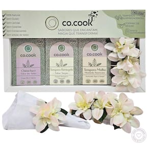 O Kit Co.Cook Sabores que Florescem é um convite para uma mesa vibrante e cheia de personalidade. Inclui 2 temperos artesanais: Chimichurri Sabor Andes, com ervas intensas e aroma marcante, ideal para carnes e vegetais grelhados; e Berinjela Sabor Turquia, com especiarias quentes e toques mediterrâneos. Acompanha Topping de Molho Mostarda, cremoso e levemente picante, perfeito para finalizar saladas, sanduíches e entradas. Para encantar sua mesa, 4 porta-guardanapos com flor de laranjeira em tons suaves, símbolo de renovação e delicadeza. Uma experiência sensorial que floresce a cada detalhe. Marca: Não Informado
