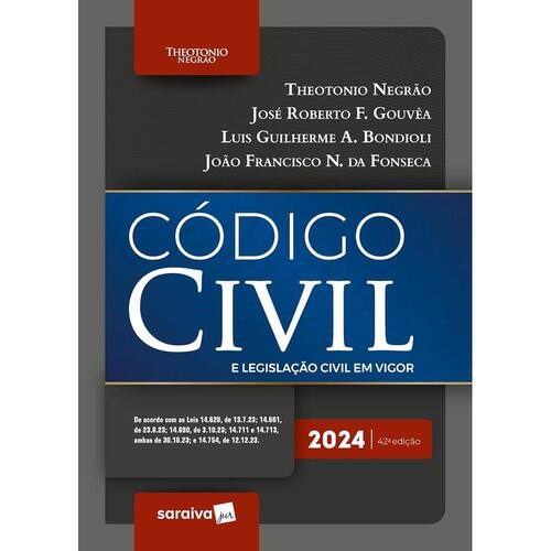 CÓDIGO CIVIL E LEGISLAÇÃO CIVIL EM VIGOR, mantendo a essência de uma obra que se destaca pelos minuciosos comentários artigo por artigo, as principais decisões de Tribunais e referências a outros artigos e leis. Trata se de obra imprescindível aos profissionais do Direito e também aos estudantes que ingressam ao estágio em Direito e que necessitam de informações seguras e precisas a respeito de todo o universo do Direito Civil. A presente 42ª edição está de atualizada de acordo com as Leis 14.620, de 13-7-23; 14.661, de 23-8-23; 14.690, de 3-10-23; 14.711 e 14.713, ambas de 30-10-23; e 14.754, de 12-12-23. Data de fechamento da edição: 18-1-2024.