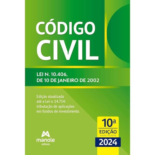 A Editora Manole, prosseguindo com suas publicações jurídicas, apresenta agora seu volume de bolso contendo exclusivamente o Código Civil (Lei n. 10.406, de 10.01.2002). Edição atualizada até a Lei n. 14.754: tributação de aplicações em fundos de investimento. A data de fechamento desta edição é 19.12.2023, e o leitor poderá manter-se informado sobre as mudanças na legislação até 31.10.2024.