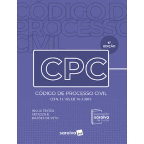 Data de fechamento: 24-11-2023 A Editora Saraiva, líder no mercado de livros jurídicos e sempre atenta às necessidades dos profissionais e interessados neste meio, apresenta a nova edição da obra CPC Legislação Saraiva de Bolso .Esta obra é composta pela Lei n. 13.105, de 16-3-2015 (Código de Processo Civil), sem notas editoriais, para rápida consulta no dia a dia. Seu formato de bolso garante praticidade e portabilidade, tudo com a tradição e a qualidade Saraiva Educação. Últimas atualizações no texto do CPC: - Lei n. 14.713, de30-10-2023 (art. 699-A Ações de Guarda em caso de violência doméstica ou familiar) - Lei n. 14.711, de 30-10-2023(art. 784 Contrato de contra garantia) - Lei n. 14.620, de 13-7-2023 (art. 784 Assinatura de títulos executivos eletrônicos)