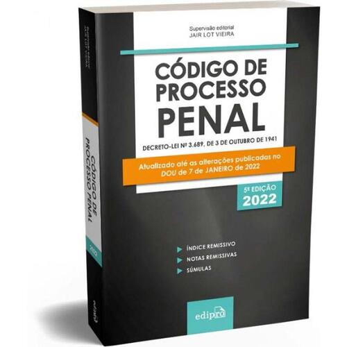 Código de Processo Penal Decreto-Lei nº 3.689, de 3 de outubro de 1941 Atualizado até a Lei nº 14.245, de 22 de novembro de 2021, e até o DOU de 7 de JANEIRO de 2022 Inclui: Índice remissivo; Notas remissivas; Lei de Execução Penal; Legislação complementar; Resoluções do CNJ; Súmulas e Súmulas Vinculantes do STF; Temas com Repercussão Geral do STF; Súmulas do STJ.