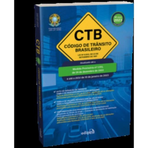 SUPER LANÇAMENTO: Código de Trânsito Brasileiro CTB, Lei nº 9.503, de 23 de setembro de 1997 Atualizado até a Medida Provisória nº 1.153, de 29 de dezembro de 2022, e até o DOU de 10 de janeiro de 2023 Esta edição inclui as mais recentes alterações efetuadas pela Medida Provisória nº 1.153, de 29.12.2022, que prorroga a exigência do exame toxicológico periódico e dá outras providências. AUTO DE INFRAÇÃO DE TRÂNSITO TABELA DE ENQUADRAMENTOS DAS INFRAÇÕES Portaria SENATRAN nº 354, de 31.3.2022, atualizada até as alterações promovidas pela Portaria SENATRAN nº 4, de 3.1.2023 TABELA DE VALORES REFERENCIAIS DE VELOCIDADE TABELA PARA ENQUADRAMENTO INFRACIONAL Resolução CONTRAN nº 798, de 2.9.2020, atualizada até as alterações promovidas pela Resolução CONTRAN nº 804, de 16.11.2020 UNIFORMIZAÇÃO DOS PROCEDIMENTOS ADMINISTRATIVOS Suspensão do direito de dirigir Cassação do documento de habilitação Curso preventivo de reciclagem Deliberação CONTRAN nº 163, de 31.10.2017 Resolução CONTRAN nº 723, de 6.2.2018, atualizada até as alterações promovidas pela Resolução CONTRAN nº 844, de 9.4.2021 Ean: 9786556601014