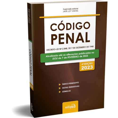 SUPERLANÇAMENTO: Código Penal – Decreto-Lei nº 2.848, de 7 de dezembro de 1940 Atualizado até a Lei nº 14.532, de 11 de janeiro de 2023, e até o DOU de 7 de fevereiro de 2023: Lei das Contravenções Penais Resoluções do CNJ ADPF nº 54 e ADPF nº 187 Súmulas e Súmulas Vinculantes do STF Temas com Repercussão Geral do STF Súmulas do STJ Índice remissivo Notas remissivas