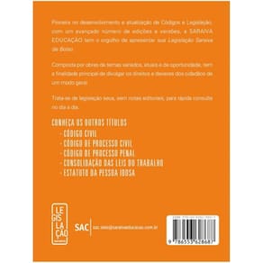 Data de fechamento da obra: 4-4-2024AEditora Saraiva Jur, líder no mercado de livros jurídicos e sempre atenta àsnecessidades dos profissionais e interessados neste meio, apresenta a edição daobra Código Penal ¿ Legislação Saraivade Bolso. Estaobra é composta pelo Decreto-lei n. 2.848, de 7 de dezembro de 1940, sem notaseditoriais, para rápida consulta no dia a dia. ÚltimasAtualizações no texto do Código Penal:- Intimidação sistemática virtual(cyberbullying)(Lei n. 14.811, de 12-1-2024) -Adulteração de sinal identificador de veículo (Lei n. 14.562, de26-4-2023)
