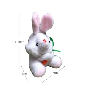 Dimensão Coelho de Pelúcia: 11,5 cm x 7 cm x 5 cm (Altura x Largura x Espessura)