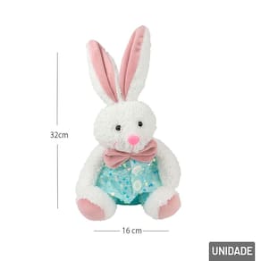 Coelho de Pelúcia Páscoa 32cm Sentado Decor Este adorável Coelho de Pelúcia Sentado Páscoa é uma peça encantadora para dar um toque acolhedor e festivo à sua decoração de Páscoa. Com 32cm de altura, ele apresenta um design fofo e detalhado, perfeito para trazer a suavidade e o charme típicos dessa época do ano. Seu visual delicado e as cores suaves fazem dele um enfeite perfeito para mesas, prateleiras ou até como presente para os amantes da Páscoa.\nEste coelho é feito de pelúcia macia e fofinha, proporcionando uma sensação agradável ao toque. Sua pelagem é suave e de alta qualidade, com um acabamento impecável que garante durabilidade e um visual acolhedor. O coelho está em uma pose sentada, com as patinhas da frente levemente dobradas, o que confere um toque de tranquilidade e serenidade à sua aparência. O coelho é confeccionado com materiais de alta qualidade, tanto na pelúcia quanto nos detalhes de acabamento.\nEspecificações:\nMarca : TINGS\nTipo de material : Poliéster\nCores ou Estampa : Colorido\nDimensões do Produto : 32 X 16 X 14 CM\nDimensões da Embalagem : 32 X 16 X 14 CM\nPeso Bruto (Gramas) : 0.233 Marca: Não Informado