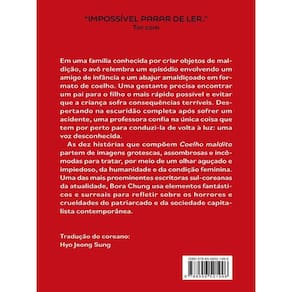 Os contos presentes em Coelho maldito, livro finalista do International Booker Prize, transitam entre realismo mágico, folclore, horror, ficção científica e fantasia, partindo de elementos insólitos para narrar histórias assombrosas que tocam em temas profundamente reais. A coletânea é a primeira obra de Bora Chung, uma das mais notáveis escritoras sul-coreanas da atualidade, publicada fora da Coreia. Em uma família cujos negócios consistem em criar objetos de maldição, o avô relembra um episódio envolvendo um amigo de infância e um abajur amaldiçoado em formato de coelho. Uma gestante precisa encontrar um pai para o filho o mais rápido possível, e evitar que a criança sofra consequências terríveis. Despertando no completo escuro após sofrer um acidente, uma professora confia na única coisa que tem por perto para levá-la de volta à luz: uma voz desconhecida. As dez histórias que compõem Coelho maldito partem de imagens grotescas, assombrosas e incômodas para tratar, por meio de um olhar aguçado e impiedoso, da humanidade e da condição feminina. Uma das mais proeminentes escritoras sul-coreanas da atualidade, Bora Chung usa elementos fantásticos e surreais para refletir sobre os horrores e crueldades do patriarcado e da sociedade capitalista contemporânea.  “Com a linguagem concisa e eficaz de Chung, é impossível parar de ler.” — Tor. com