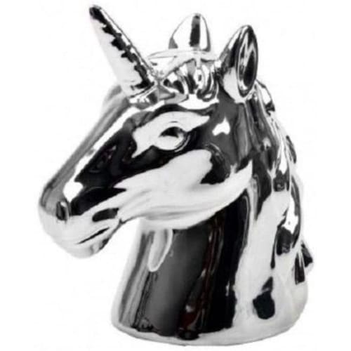 Cofre Cabeça de Unicórnio é feito em cerâmica, na cor prata. O cofre possui abertura na parte superior e inferior da cabeça. A abertura da parte inferior possui um tampão. O cofre possui altura de 15cm e Largura de 14cm. Recomendamos o uso para decorar e guardar dinheiro. Marca: Make Store
