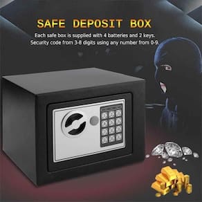 Cofre Eletronico Digital Teclado Fechadura Eletronica Com Senha Sos Chave Em Aco Descrição O Cofre Eletrônico foi desenvolvido pensando em segurança, praticidade e eficiência. Construído em aço resistente, possui trava eletrônica para aumentar sua segurança. RESISTÊNCIA