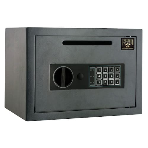 Cofre de segurança eletrônico – Seguro contra quedas com teclado digital e 2 teclas de substituição manual para entrega de dinheiro ou segurança doméstica da Paragon Safes (preto) - Cofre seguro – com um compartimento de entrega de 15 cm de comprimento, você pode manter documentos, envelopes e depósitos em dinheiro seguros com esta caixa de entrega. - Fechaduras SAFEPASSCODE – O cofre possui um teclado LED com códigos de acesso programáveis de 3 a 8 dígitos e 2 teclas de substituição manual para acesso rápido aos seus objetos de valor. - Design seguro e durável – O cofre de depósito é feito com aço calibre 11, dobradiças internas para proteção extra, interior e exterior revestidos com pó, e inclui parafusos de fixação para ancoragem. - Armazenamento seguro de dinheiro – O cofre resistente é feito de aço sólido revestido a pó calibre 11 com dobradiças internas ocultas para segurança extra. Fique tranquilo sabendo que seus valiosos ativos estão trancados com segurança neste cofre de depósito digital. - DETALHES SEGUROS DO PRODUTO - Materiais: Aço revestido com pó. Dimensões seguras: (C) 35,9 cm x (L) 25,4 cm x (A) 25,4 cm; Interior: (C) 34,3 cm x (L) 18,4 cm x (A) 24 cm; Ranhura: (L) 15,2 cm x (A) 1,3 cm. Peso seguro: 10 kg. SAFE4 pilhas AA e parafusos de ancoragem incluídos. Cor segura: cinza escuro