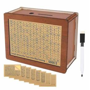 É uma caixa de madeira estilizada e funcional, com design decorativo, usada para armazenar dinheiro de maneira criativa e planejada.
