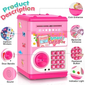 Como alterar senhas: 1. Insira seu código, o novo padrão é 0000. 2. Abra a porta. Enquanto a porta estiver aberta, pressione e segure o botão STAR *. 3. As luzes começarão a piscar. (Segure o botão " * " e não afrouxe). 4. Insira o código de quatro dígitos desejado dentro de 15 segundos e pressione o botão NUMBER #. 5. As luzes vão parar de piscar. Agora você pode soltar o botão STAR *. - Um cofrinho infantil é uma pequena ferramenta de economia usada para ajudar as crianças a desenvolver o hábito de economizar. Plástico ABS ambiental; design de simulação seguro, sem odor e resistente, e não quebra facilmente - Esses cofrinhos geralmente apresentam designs fofos, vêm com 3 notas de teste, 2 adesivos de alfabeto de animais e um manual de instruções. Padrões fofos atraem as crianças para chamar sua atenção e inspirar seu interesse em economizar - Os cofrinhos infantis geralmente têm uma pequena abertura para inserir moedas ou notas. Insira o papel-moeda no compartimento em cima do caixa eletrônico infantil, ele pode ser enrolado no caixa eletrônico automaticamente. Fácil para as crianças usarem. (Mas não funciona se o papel for muito velho ou muito macio) - Acessível e prático – Este banco de dinheiro é uma solução barata e prática para pais que querem ensinar seus filhos sobre gerenciamento de dinheiro. Isso ajuda a desenvolver seu senso de responsabilidade financeira e economia - As crianças vão adorar receber este banco legal para economizar dinheiro. É divertido e educativo e ensina a importância de economizar. É a melhor escolha para presentes de aniversário de crianças e presentes de Natal, Ano Novo. É o melhor presente de Natal e aniversário para crianças de 3, 4, 5, 6, 7, 8, 9, 10, 11 e 12 anos, meninos e meninas