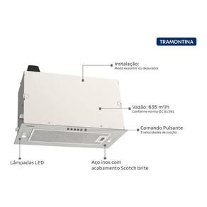 Se você possui uma cozinha compacta, mas não abre mão de nenhum item para deixá-la ainda melhor, precisa conhecer a coifa de embutir Tramontina Incasso 51 em aço inox com acabamento Scotch Brite 51 centímetros. Desenvolvida para proporcionar maior funcionalidade para seu dia a dia na cozinha, ela acompanha as tendências das cozinhas atuais, que têm tamanho compacto e são práticas. Ela pode ser instalada no modo depurador ou exaustor e conta com três velocidades de perfeito desempenho, onde na velocidade 3 a vazão chega a 630 m/h e com quase nenhum ruído. É a coifa ideal para cozinhas menores e promete revolucionar pequenos ambientes. A coifa ainda vem com filtro de alumínio lavável e outros dois filtros de carvão ativado Ambifresh 1 Round para utilização no modo depurador, dois acessórios que garantem maior eficiência na remoção de odores indesejados. Escolha Tramontina e transforme sua cozinha, seja ela do tamanho que forbr /br /Instalação: Embutirbr /Tensão: 127V e 220Vbr /Material: Aço Inox AISI 430br /Frequência: 50 - 60 Hzbr /Potência Máxima: 225 W - 127Vbr /Potência Máxima: 260 W - 220Vbr /Comando: Pulsantebr /Velocidades: 3br /Nivel de Ruído: 63 db A - cfe. Norma IEC 60704br /Vazão: 630 m3/hora - cfe. Norma IEC 61591br /Iluminação: 2 lâmpadas led 2 x 1,5 W br /Filtro Metálico Lavável: 1br /Filtro de Carvão: 2 AmbiFresh Round 1br /Acessórios Inclusos:br /- Kit para instalaçãobr /- 2 Filtros de carvão ativado AmbiFresh Round 1br /- Tubo flexível 2 metros br /Imagens Ilustrativas. As tonalidades e acabamentos texturas podem variar de um produto a outro.br /br /Verifique se a tensão de alimentação indicada na etiqueta de identificação do produto localizada na parte interna da coifa, é a mesma da sua residência 127V ou 220V, a coifa não é bivolt.br /Na função exaustor os vapores e a fumaça provenientes do processo de cozimento entram pela coifa, são filtrados através do filtro metálico onde fica retida a gordura e conduzida para o ambiente externo através de um duto.br /Na função depurador, os vapores e a fumaça passam pelo filtro metálico onde fica retida a gordura e por um filtro de carvão ativado onde o ar é purificado, retornando para o ambiente livre de odores. Neste caso não é necessário fazer abertura externa para o duto de saída.br /Em ambas as funções é necessária a limpeza periódica dos filtros metálicos, sendo que na função depurador, o filtro de carvão deve ser substituído e jamais lavados e reutilizados conforme no manual de instruções.br /Recomenda-se que a instalação da coifa seja feita pela Rede de Serviço Autorizado Tramontina.br /Instalação por conta do consumidor. Uso doméstico.br /A coifa deverá ser instalada a uma altura mínima de 650 mm e máxima de 750 mm dos queimadores do cooktop ou fogão.br /Para mais informações de como deve ser feita a limpeza do produto, consultar o manual de instruções.br /br /EAN13: 7894693752468 - 127Vbr /EAN13: 7894693752475 - 220Vbr /DUN14: 17894693752465 - 127Vbr /DUN14: 17894693752472 - 220Vbr /NCM: 8414.60.00br /Peso Líquido: 8,0000 kg.br /Peso Bruto: 11,4000 kg.br /Metragem: 0,130032 m.br /Dimensões Produto Compr. X Larg. X Alt. : 510x 270x 335 mm.br /br /br /Certificação/Normas:br /Produto certificado cfe. OCP-0029, UL, Segurança compulsório, Inmetro.br /br /Linha Comercial:br /Perfectabr /br /OBS.: Escolher a voltagem no ato da compra. Ean: 7894693752468