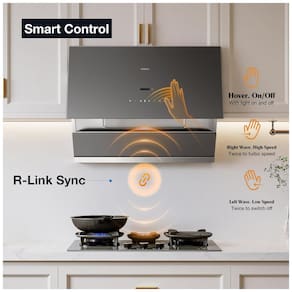Recursos e tecnologias: Motor BLDC, controle por gestos, painel touch, ajuste automático de velocidade, revestimento nano resistente a manchas e impressões digitais, ampla área de contenção em aço inox, coletor de óleo de grande capacidade, iluminação LED, sincronização R-Link com cooktop compatível, lembrete de limpeza e bloqueio de tela para higienização