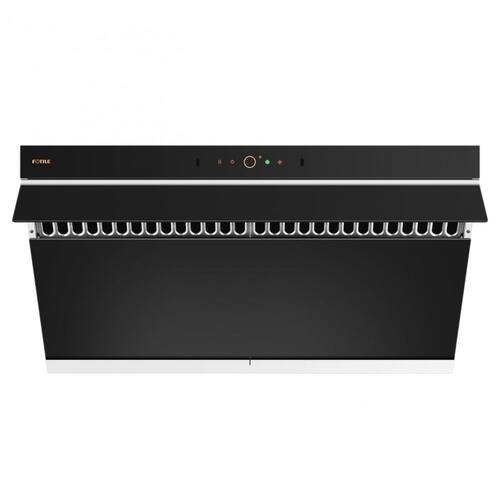 A coifa de embutir sob armário ou parede Fotile JQG9007 de 91 cm na cor preta é indicada para cozinhas residenciais com fogões de 36 polegadas, utilizando desenho de sucção inclinada para aumentar a eficiência de captura de fumaça e vapores na região frontal do fogão. A estrutura combina corpo em aço inoxidável com painel em vidro temperado preto, adequada para instalação sob armário ou diretamente na parede em sistemas de exaustão com duto.