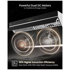 O sistema de ventilação emprega dois motores DC com vazão equivalente de 1100 CFM e pressão estática máxima de 540 Pa, dimensionado para remover fumaça, gordura e odores em diferentes níveis de intensidade de cocção. A coifa oferece quatro velocidades de operação, incluindo modo para frituras com reforço de potência, comandadas por painel touch frontal com temporizador de desligamento automático após alguns minutos.