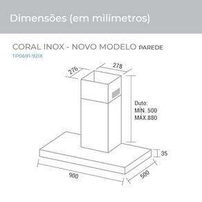 ESPECIFICAÇÕES TÉCNICAS Nome do produto: Coifa de Parede Coral Cor: Inox Modelo 127V: TP0691IX Código EAN 127V: 789.651.851.580-7 Modelo 220V: TP0692IX Código EAN 220V: 789.651.851.581-4 Qtd. pçs. caixa: 1