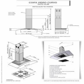 Observações: Instalação somente na parede - Para cooktops de 4 bocas: coifa de 60 ou 70 cm - Para 5 bocas: coifa de 75, 80 ou 90 cm - Para 6 bocas: coifa de 90 cm ou maior - A coifa deve ser um pouco mais larga que o fogão/cooktop - Vidro com variação de até 7 mm; nichos devem ter folga mínima de 1 cm por lado.