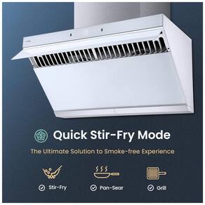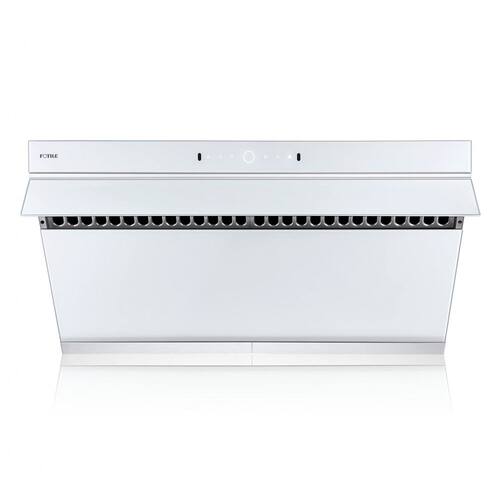 Esta coifa de cozinha foi projetada para instalação sob gabinete ou na parede, com design inclinado que direciona a sucção próxima à área de cocção para capturar fumaça e vapores de forma eficiente em fogões de 5 a 6 queimadores. A estrutura combina aço inox com vidro temperado branco, com placa de captura que se abre em ângulo de 90° para melhorar o fluxo de ar.