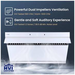 Recursos e tecnologias: Motores DC duplos, placa de captura com abertura automática a 90°, comando por toque, ativação por movimento, 4 velocidades, função desligamento automático, iluminação LED, filtros baffle removíveis, bandejas coletoras de gordura