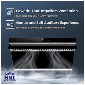 Recursos e tecnologias: Motores DC duplos, placa de captura com abertura automática a 90°, comando por toque, ativação por movimento, 4 velocidades, função desligamento automático, iluminação LED, filtros baffle metálicos removíveis, bandejas coletoras de gordura