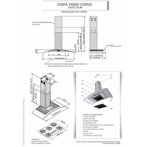As dimensões do produto podem sofrer uma pequena variação de largura do vidro, de até 7 sete milímetros. Por este motivo, quando a coifa for instalada de forma embutida em nichos, o fabricante recomenda que seja considerada uma folga de pelo menos 1 cm em cada lado