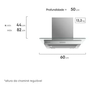 Dimensões compactas: Com 44 cm de altura, 60 cm de largura e 50 cm de profundidade, a coifa é projetada para se encaixar facilmente em sua cozinha, independentemente do tamanho do espaço.