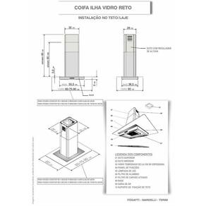 As dimensões do produto podem sofrer uma pequena variação de largura do vidro, de até 7 sete milímetros. Por este motivo, quando a coifa for instalada de forma embutida em nichos, o fabricante recomenda que seja considerada uma folga de pelo menos 1 cm em cada lado