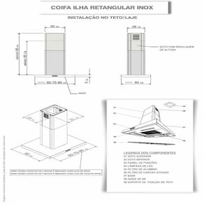 Dimensões Altura total de 90 cm, com regulagem entre 65 cm e 90 cm, já considerando a base da coifa Largura 90 cm Profundidade 60 cm Altura base 5 cm Peso 29,20 kg Dimensões do duto L 32 cm x P 28 cm, dividido em duas partes
