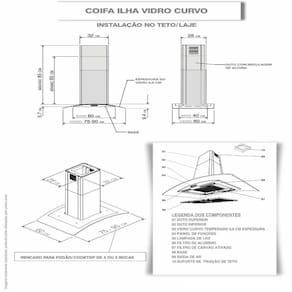 Observações: Instalação exclusiva em ilha (teto); Para cooktop de 4 bocas: coifa de 60 ou 70 cm; Para cooktop de 5 bocas: coifa de 75, 80 ou 90 cm; Para cooktop de 6 bocas: coifa de 90 cm ou maior; A coifa deve ser sempre um pouco maior que o fogão; Vidro com variação de até 7 mm; para nichos, deixar 1 cm de folga por lado.