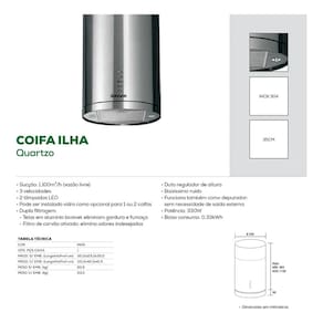 Especificações Técnicas Nome do Produto: Coifa de Ilha Quartzo Cor: Inox Modelo 127v: Tp3521ix Modelo 220v: Tp3522ix
