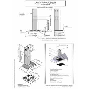 As dimensões do produto podem sofrer uma pequena variação de largura do vidro, de até 7 sete milímetros. Por este motivo, quando a coifa for instalada de forma embutida em nichos, o fabricante recomenda que seja considerada uma folga de pelo menos 1 cm em cada lado