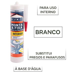 Cascola monta & fixa pl 500 é uma cola de montagem de alta resistência indicada para instalações, decorações e reparos internos, sendo uma solução ideial para colagem de madeira, mdf, compensando, drywall, polestireno expandido, cerâmica, concreto, metal, pedra, vidro e cortiça. Prático de usar, cascola monta & fixa pl 500 garante a eficiência na aplicação, uma vez que o produto proporciona uma excelente colagem e força final, eliminando a necessidade de furar, parafusar ou pregar.