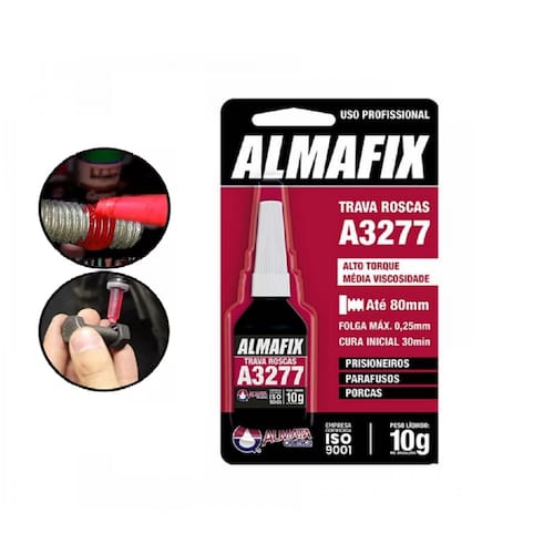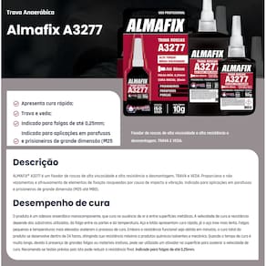 Ela é a escolha ideal para aplicações exigentes, especialmente em parafusos e prisioneiros de grande dimensão, de M25 até M80 com folgas de até 0,25mm. Além disso, a Almafix Trava Roscas A3277, oferece uma fixação confiável e duradoura em aplicações que exigem alta resistência.