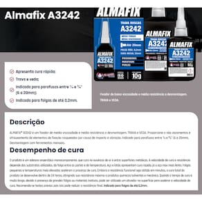 DESCRIÇÃO A Almafix Trava Roscas A3242 é um adesivo anaeróbico monocomponente que cura na ausência de ar, criando uma união duradoura entre superfícies metálicas. A velocidade e resistência de cura dependem dos substratos utilizados, da folga entre as partes e da temperatura.