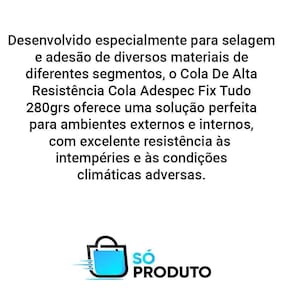 DescriçãoDesenvolvido especialmente para selagem e adesão de diversos materiais de diferentes segmentos, o cola de alta resistência cola adespec fix tudo 280grs oferece uma solução perfeita para aplicações em ambientes externos e internos, com excelente resistência às intempéries e às condições climáticas adversas.DetalhesÉ um selante adesivo monocomponente de alta tecnologia que cura através da umidade do ar formando um elastômero de alta resistência.EspecificaçõesMarca pesiloxContém 1 cartucho de 280gCor transparenteAdesão facilmente em materiais como borracha, vidro, cobre, alumínio, alo e a maioria dos plásticos. Aceita adesões como vidro com alumínio ou borracha com metal. Ideal para vedações e colagens de substratos. Pode ser aplicado para vedação de box, pias, encanamentos e esquadrias ou selagem de juntas de conexões metálicas.Validade: 12 mesesCaracterísticasPossui uma longa vida útil e é extremamente fácil de aplicar, garantindo um resultado perfeito em todas as superfícies.As imagens são meramente ilustrativas Marca: Pesilox