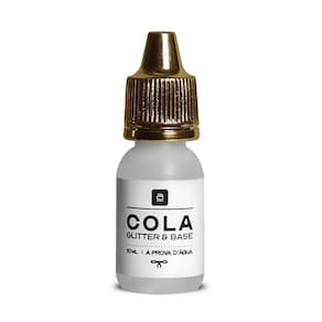 Para fixar glitters e pigmentos, uma simples gotinha é suficiente para olho inteiro. Utilize uma superfície limpa .