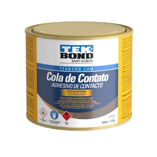 Cola de contato adesivo tekbond 380ml / 400g madeira Vendido por ferramentas e gabaritos Descrição: A cola de contato é um adesivo a base de borracha de neoprene, desenvolvido para colagens de alto desempenho em diferentes materiais, entre si e combinado sem diversos tipos de aplicações. É um adesivo de uso geral, pode ser utilizado na colagem de couro, tecidos, fibras, tapeçaria de automóveis, madeira, papelão, carpetes, etc. Não adere materiais a base de polipropileno, polietileno e teflon. Instruções de uso e manuseio: - agite bem antes de usar. As superfícies a serem coladas devem estar limpas, secas e livres e oleosidade e gorduras. Superfícies porosas devem ser lixadas antes da aplicação do adesivo. - faça um teste preliminar com o material desejado para determinar a quantidade necessária de adesivos e compatibilidade de substratos. - aplique uma camada de cola em ambas as superfícies. Aguarde a secagem 5 a 10 min . - monte as peças, exercendo pressão do centro para as bordas, evitando a formação de bolhas. - temperatura recomendada para a aplicação: entre 18ºc e 25ºc. - para manuseio do produto, recomenda-se a utilização de epis. Para maiores informações de segurança, consultar a fispq do produto. Limitações de uso: A cola de contato tekbond não é indicada para as seguintes situações: - para as superfícies que estejam com contato direto dos alimentos. - não recomendado para aplicações de imersão contínua em água. - não recomendado para uso em juntas abaixo do solo ou trafegáveis. Especificações: - base química: adesivo a base de neoprene - aparência visual : líquido levemente amarelado - viscosidade a 25 ºc: 2.000 a 3.000 cps - densidade a 25 ºc: 0,8 a 1,0 g/ml - teor de sólidos: 15 a 20 % - temperatura de aplicação: 5 a 35 ºc - temperatura de operação: - 30 a 70 ºc - tempo de cura inicial: 5 a 20 minutos - tempo de cura total: 24 horas - tempo de armazenamento à 20ºc: 12 meses Ean: 7898543383598