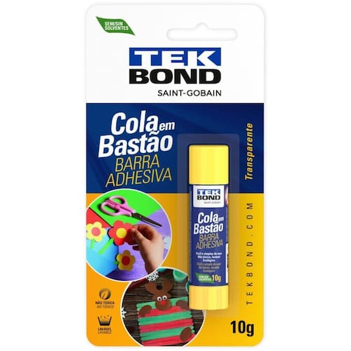 Cola em Bastao ideal para projetos escolares, artesanato e office. Possibilita a colagem de papel, cartolina, tecido, feltro e diversos tipos de materiais. DESCRICAO DO PRODUTOA Cola em Bastao da Tekbond e ideal para colagens em papel, cartolina, fotos, tecido, feltro, entre outros substratos.Sua aplicacao e suave e facil de usar, oferecendo tempo suficiente para reposicionar o objeto a ser colado. PROPRIEDADES E BENEFICIOSSegura e Atoxica.Lavavel.Facil e pratica de usar.Produto certificado pelo INMETRO. MODO DE USO1. A superficie deve estar limpa, seca e isenta de gordura e cola antiga.2. Retirar a tampa e girar a base para a direita.3. Tampar apos o uso.Embalagem: BL.C/01