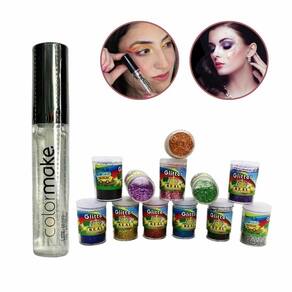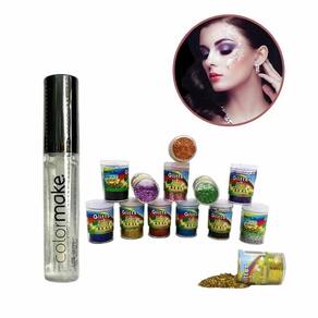 cola para glitter líquida 6ml incolor maquiagem artistica e glitter cores. Cola e glitter, para fazer aquele make incrível. A cola tem fórmula leve e incolor desenvolvida para proporcionar brilho intenso, longa duração e secagem rápida, sem causar o indesejado efeito craquelado. Isso permite que você alcance um resultado surpreendente em sua make, fácil aplicação, após aplicação use glitters para dar brilho e beleza em sua maquiagem. O kit contém: 1 cola de 6ml. 12 potes de glitter 3g cada cores. Modo de uso com auxílio do aplicador, coloque uma pequena quantidade do fixador sobre a ele, deposite o glitter e espere secar. Precauções: não ingerir, manter fora do alcance de crianças, não aplicar sobre a pele irritada ou lesionada. Ao sinal de qualquer irritação suspender o uso do produto. Como remover demaquilante.
