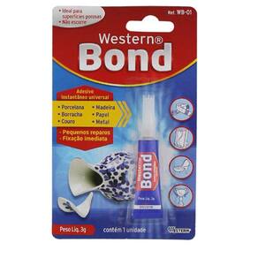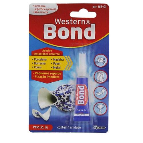 Característica do Produto: Material: ester de cianoacrilato Cor tubo azul Marca Western Embalagem blister Pequenos reparos Fixação imediata Não escorre