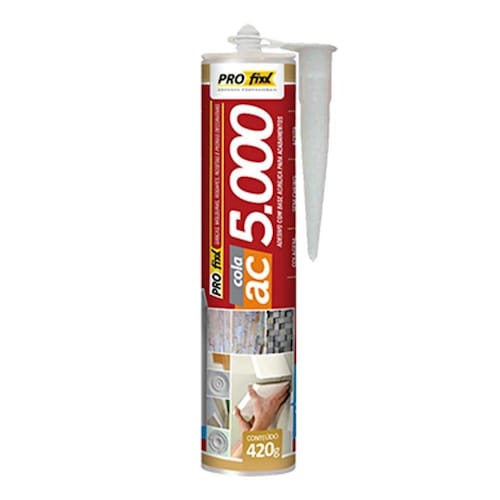Adesivo Acrílico Cola Rodapé Ac 5000 420g Branco Produto à base de emulsão acrílica com alto teor de sólidos, de fácil aplicação, especialmente desenvolvida para colagem de objetos de acabamento. Embalagem prática que facilita a aplicação e reduz o desperdício. Ótima resistência à tração e compressão em locais com movimentação constante. Indicação Ideal para fixação de molduras, sancas, rosetas e rodapés em poliestireno, gesso, madeira e MDF além de pedras decorativas, pastilhas e azulejos. Benefícios Produto pronto para o uso, de fácil aplicação, secagem rápida e alto rendimento. Preparação da Superfície Eliminar todo pó, manchas de gordura ou graxa, mofo, partes soltas e deixar o substrato livre de qualquer impregnação que possa prejudicar a aderência do produto ao substrato. Se for necessário, lixar e lavar a superfície para deixála firme. Aplicação do produto Utilizar pistola de aplicação, espátula de aço lisa ou espátula dentada com dentes pequenos, de no máximo 5 mm para cerâmicas de médio porte e 3 mm para peças pequenas. Aplicar o revestimento imediatamente. Após aplicar o revestimento, pressionar até obter o nivelamento desejado. Para colagem de molduras, sancas e rodapés, aplicar o produto em forma de cordão, pontos de adesão ou espalhando com espátula. Rendimento em torno de 12 metros lineares para cada 420g de produto. Tempo de secagem Cura total em 30 minutos Bisnaga de 420 gramas. Validade 12 meses a partir da data de fabricação.