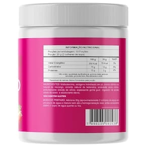 INGREDIENTES: Colágeno hidrolisado em pó, maltodextrina, espessante goma guar, corante natural de beterraba, aroma idêntico ao natural de morango, edulcorante stévia e antiumectante dióxido de silício. NÃO CONTÉM GLÚTEN