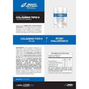 Colágeno Tipo II + Ácido Hialurônico 30 Cápsulas-Bodyaction Sabor: Sem Sabor Descrição do Anúncio 1x- colágeno Tipo II + Ácido Hialurônico 30 Cápsulas - Bodyaction Composição do Anúncio Apresentamos o Colágeno Tipo II + Ácido Hialurônico da Bodyaction, a combinação ideal para uma saúde de dentro para fora. Com Colágeno Tipo II que auxilia na mobilidade e ácido hialurônico para hidratação e revitalização da pele, esse lançamento traz a qualidade Bodyaction para apoiar seu bem-estar e sua autoestima. Não Contém Glúten. Sugestão de Uso: Ingerir uma Cápsula por via oral ao dia do suplemento alimentar. Produto indicado para maiores de 19 anos. Advertências: Mantenha fora do alcance de crianças. Este produto não é um . Não exceder a recomendação diária de consumo indicada na embalagem. Marca: Não Informado Ean: 7897104935443