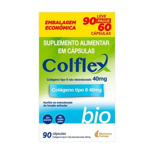 Colágeno tipo II Colflex Bio 40mg - 90 cápsulasn Colflex Bio é um suplemento alimentar feito de cápsulas de colágeno tipo II não hidrolisado. Praticamente puro, sem alteração molecular, este é um suplemento sem açúcares e sem glúten, disponível em embalagem econômica com 90 cápsulas Leve 90, pague 60 .